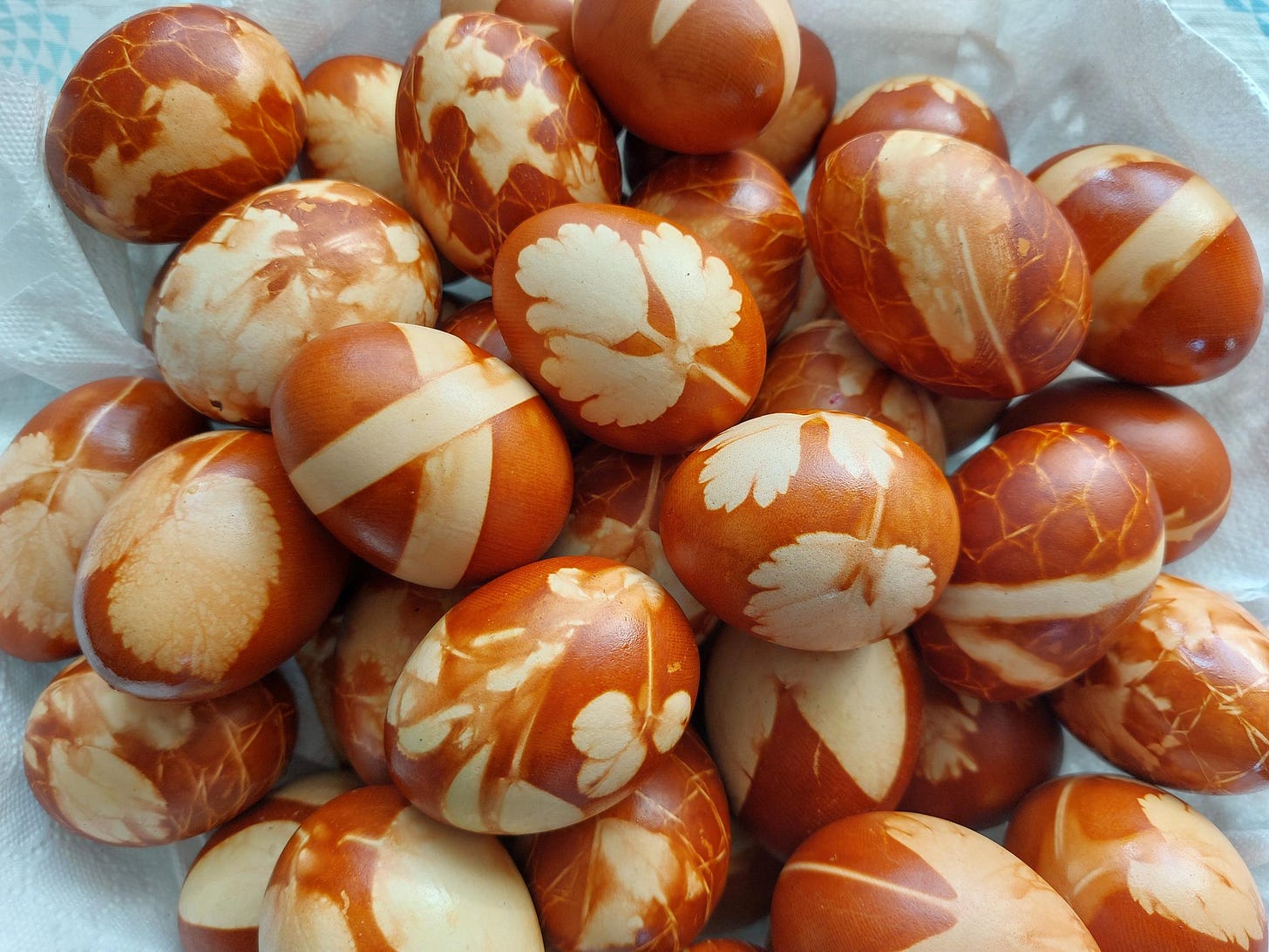 Hand-painted Easter eggs are legendary in Romania, usually a rural tradition handed down by generation, with bright colors and intricate designs. Many families, like ours, use their hens’ freshest eggs, hard-boiled and dyed naturally with red and yellow onion peels, decorated with herb leaves.